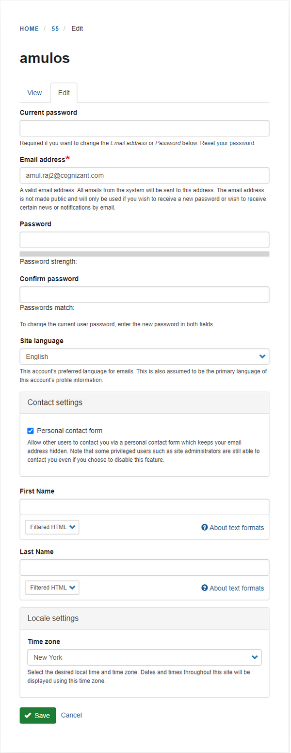 Your user account information can be managed by clicking your Username in the top left side (next to Control Panel button) of your site and clicking Edit Profile.