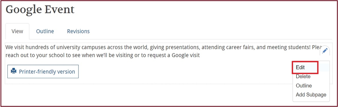 1. Edit the page, not page content, by clicking the Pencil icon and selecting Edit option.