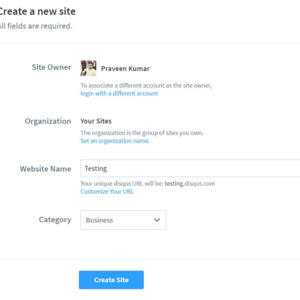 4. Fill in the form and click on the "Create Site" button. You will be prompted to select a Disqus plan for your website.