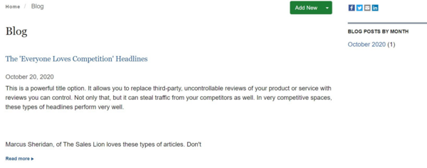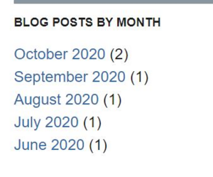 The blog archive widget titled, Blog posts by month appears to the left of your Blog landing page and displays the number of entries within the current and previous months in organized archive links. The widget will paginate after displaying five different months.