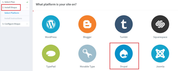 5. Click on Install Disqus button on the left and select Drupal platform, then click on the Configure button.