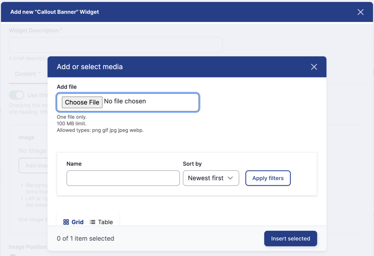 5. Upload an image from your computer or select one from the media library. If you do not provide an image, then a solid color background will appear behind the widget.