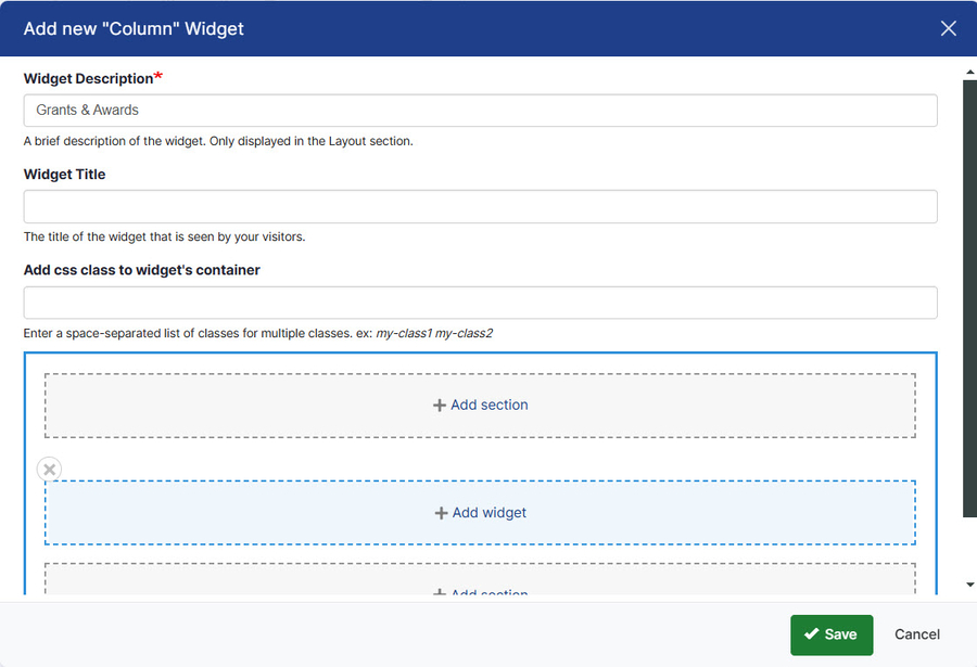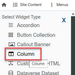 The Column Widget is a layout tool that provides a way to display content within columns. One Column Widget can have multiple sections, each with its own configuration. For example, one section can have 2 columns while the another can have 3 columns. You must have widgets to add to the columns, such as a Custom Text/HTML widget containing an image and another Custom Text/HTML widget containing text. Once you have these ready, create the Column Widget and add the Custom Text/HTML widgets to it.