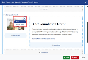 Content widgets can removed from a column widget by clicking the Edit icon and choosing Remove.