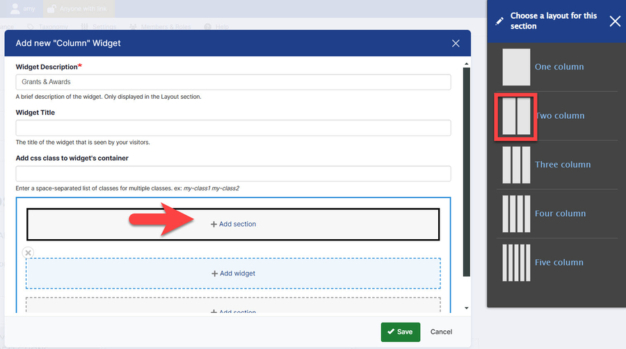 Once you establish the number of columns in a section, it cannot be changed. If you want to change the number of columns, such as from a 3-column to a 2-column, repeat the steps for adding a section, then drag the 2 widgets that are still in the 3-column section to the new 2-column area. Delete the section containing the 3 columns you no longer need.