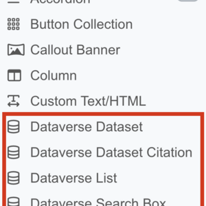 Dataverse Listing widget, Dataverse Dataset widget, Dataverse Dataset Citation widget and the Dataverse Search Box widget are created by clicking Create New Widget button and select the widget