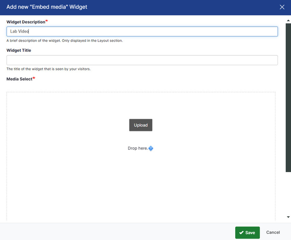 The Embed Media Widget displays embedded rich media such as files, images, videos, links and more. You can select media from your computer or saved in your files, embed HTML code, or select media from an external source.