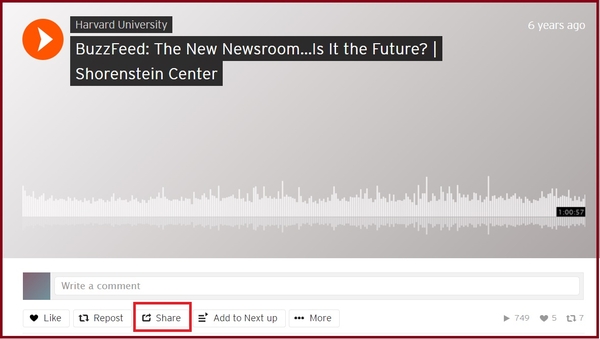 1. Click on the Share button (just below the SoundCloud audio) you want to include on your page.