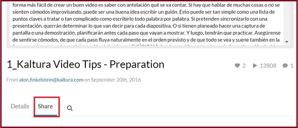 1. Click the Share option under the Kaltura video you want to include on your page.