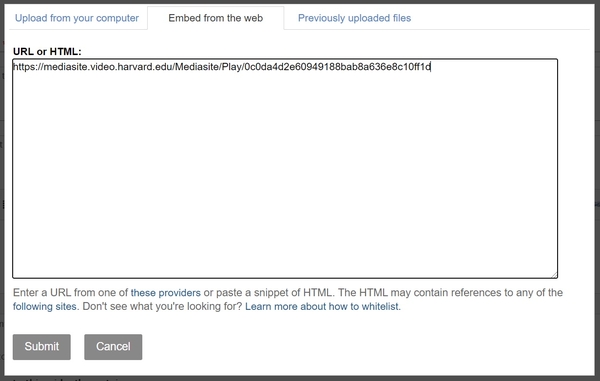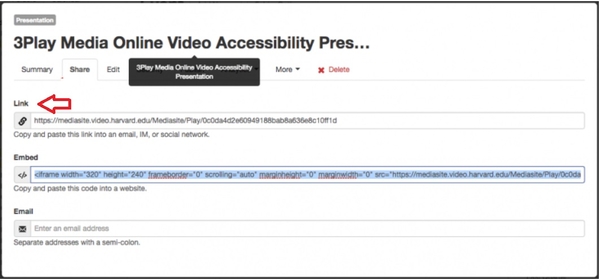2. Since Mediasite is one of the providers available in the list, you can copy either the URL or the embed code.