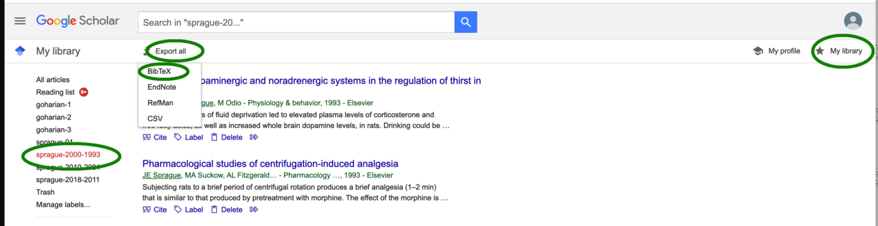 6. Click Export all on the top and select the format (say BibTex)