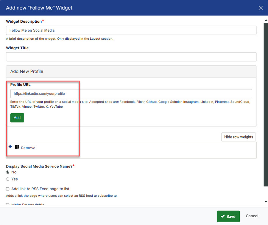 5. Configure the widget by entering the URL of your profile from a social media site. The icon will appear automatically. Accepted sites are: Bluesky, Facebook, Flickr, Github, Google Scholar, Instagram, LinkedIn, Pinterest, SoundCloud, Threads, TikTok, Vimeo, X, YouTube. You can also choose whether the widget displays the name of the social account, or just the icon.