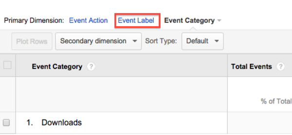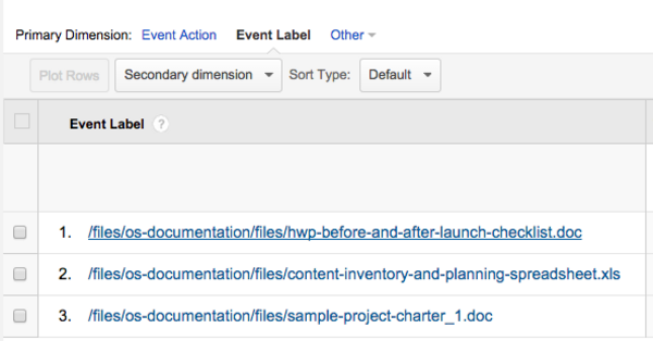 Tip: You can filter by multiple categories to get a list of specific links. For example, to see a list of downloads by file, you can click "Downloads", then filter by "Event Label":