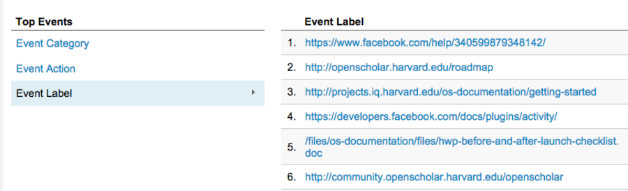 Click events for links and files are automatically tracked within OpenScholar. You don't need to configure anything extra to enable Event tracking. However you cannot modify how the information is being collected.