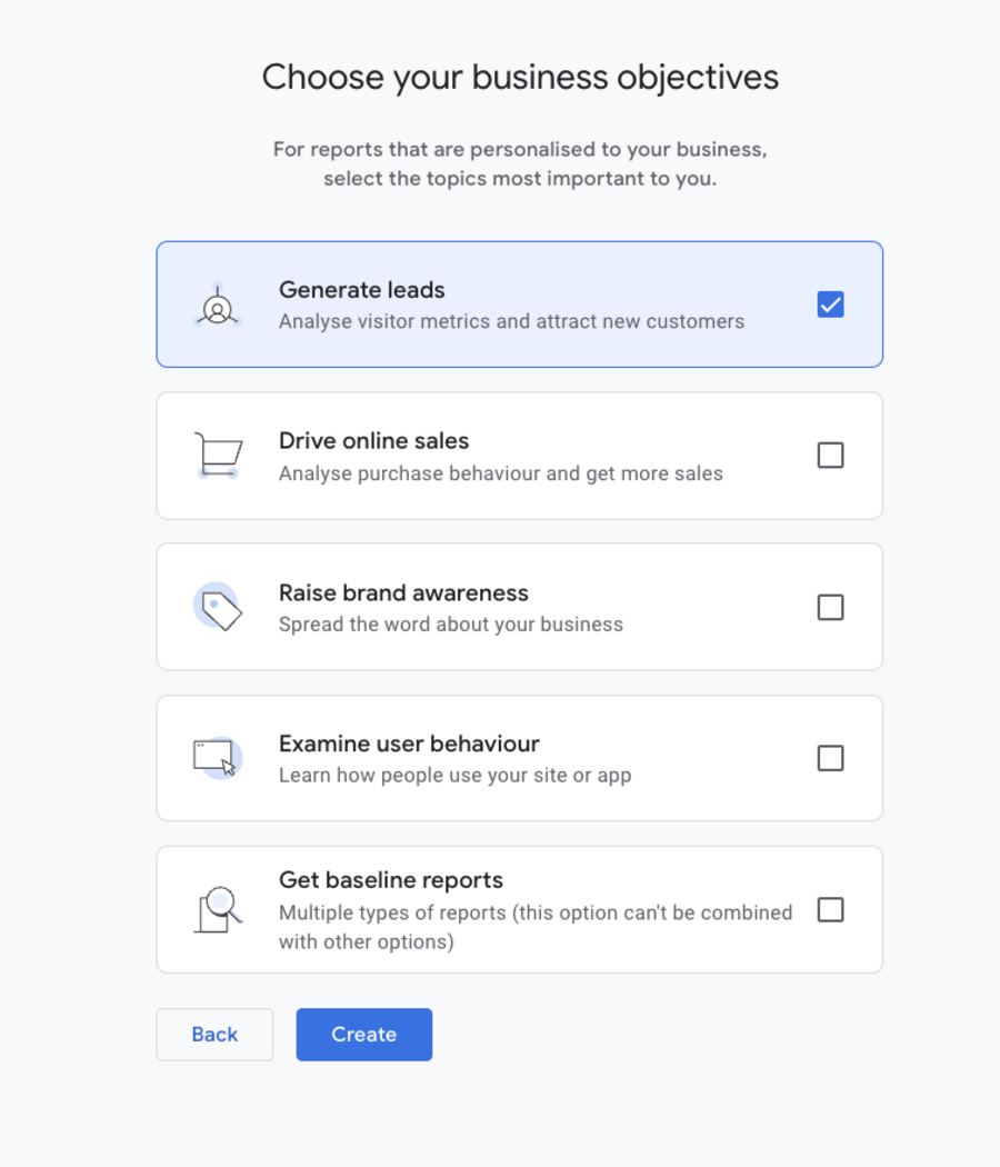 4. Answer all questions on Choose your business objectives form and click Create