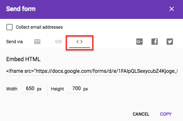 2. Click the Embed icon, adjust the width & height, and copy the iframe code.