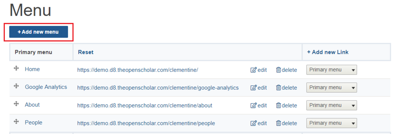 The Menus section of the Control Panel allows you to control the menu links on your site. You can completely customize the menus for your site. There are two menus pre-created for you - a "primary menu" and a "secondary menu" but you do have an option to add new menus.