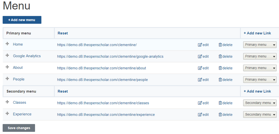 | You can also choose whether each menu item should be in the primary menu, the secondary menu, or a new menu you create. |