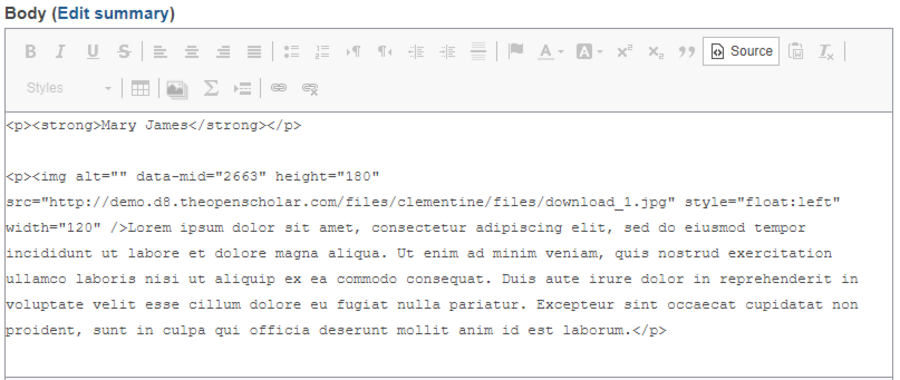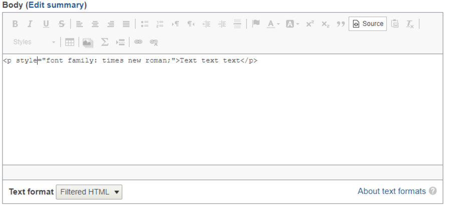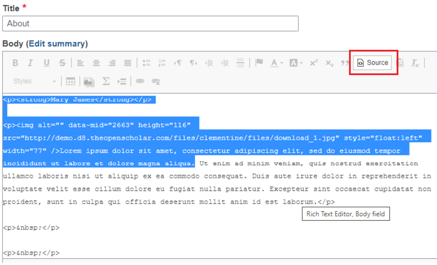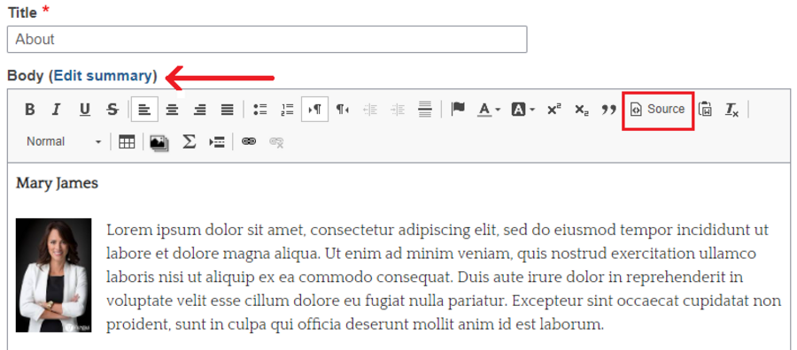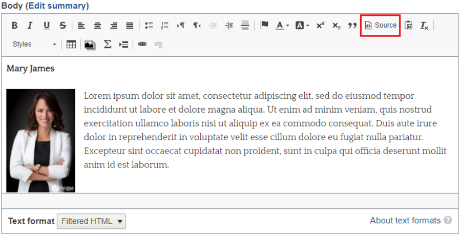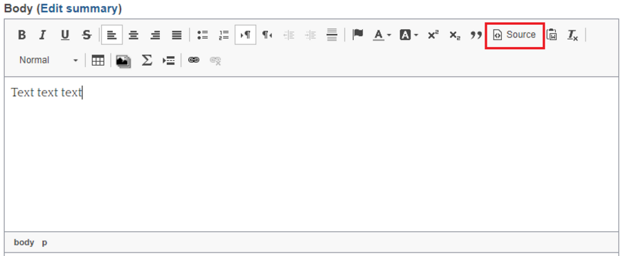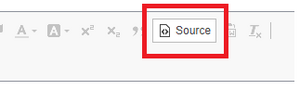 If you would prefer to add some HTML code to your text, select the Source icon in the text editor. Doing this will turn your content editing window into source code view.