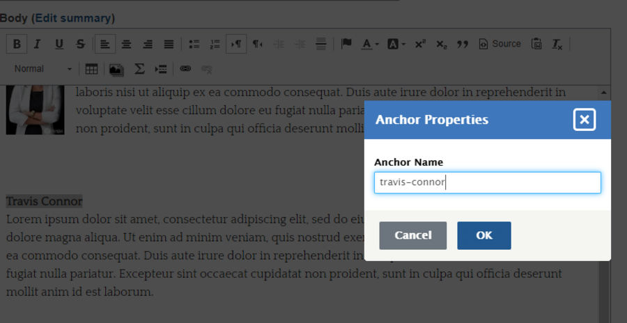 3. Give the anchor a name (lowercase/no spaces) in the available field and select the "OK" button