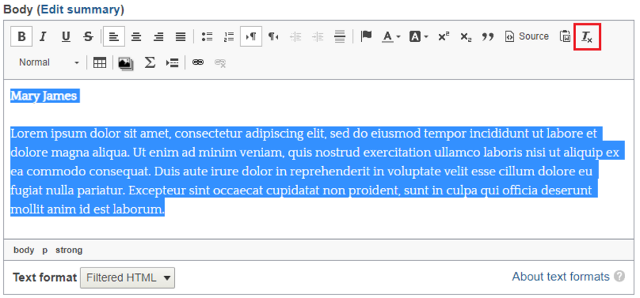 To remove formatting from your page, highlight the text and click on the Remove Formatting icon.