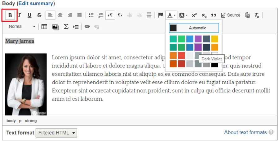 There are options for bold, italic, bulleted and numbered lists and more. Most of these you'll recognize from word processors. These are used in the same way you'd expect. Select the text you want to change, click the button and it will be bold, underlined, or change font color for you. You'll also find a couple of website-specific options.