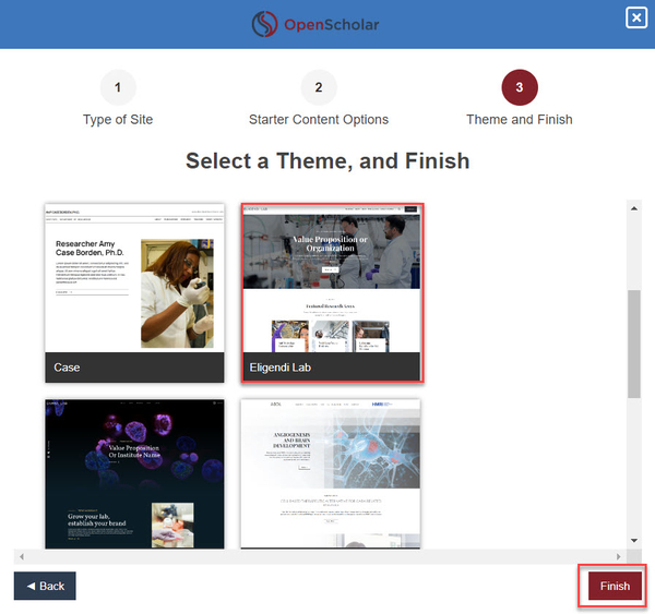 On the next screen, select the theme. Note that you may only see one theme if only that theme can be applied to the starter content. Click Finish.