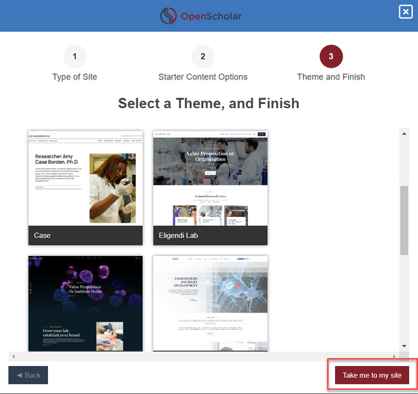 - The site theme. Your organization has a certain number of themes that have been branded with the fonts, colors, and logos for your institution. In some cases, the preset and the theme are the same. For example, if you choose Eligendi as the preset, the only theme choice will be Eligendi. Please note that while it's possible to change the theme after a site is created, we do not recommend this because the templatized aspects of the site do not always display well. If someone wants to change their theme, we recommend doing so before content is added. Contact support@theopenscholar.com for guidance.