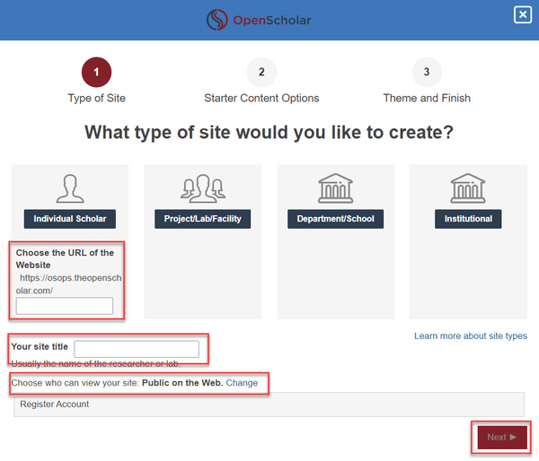 - Enter the URL in the space provided after choosing the type of site. If you are unsure which type of site to create, make your selections and click Next. You can always go back to make changes.