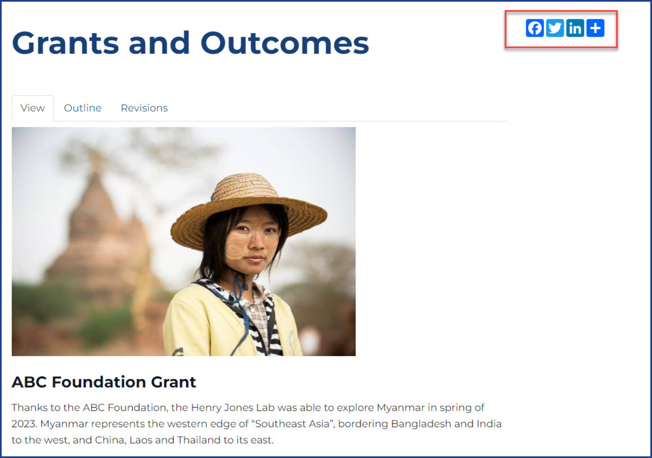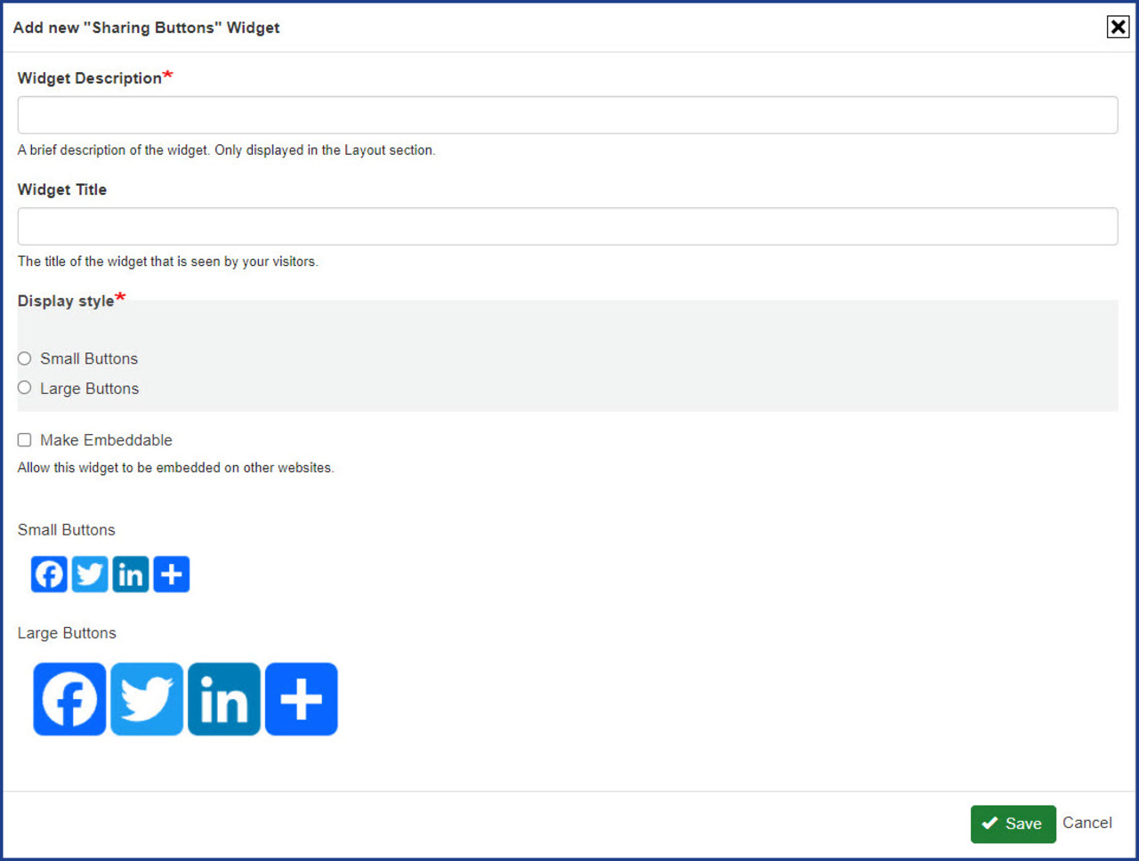The Sharing Buttons widget provides a menu that displays a variety of social media icons with the purpose of allowing a user to share the current page with their social network. Icons include Facebook, X/Twitter, LinkedIn, and a plus sign that offers many other sharing options.