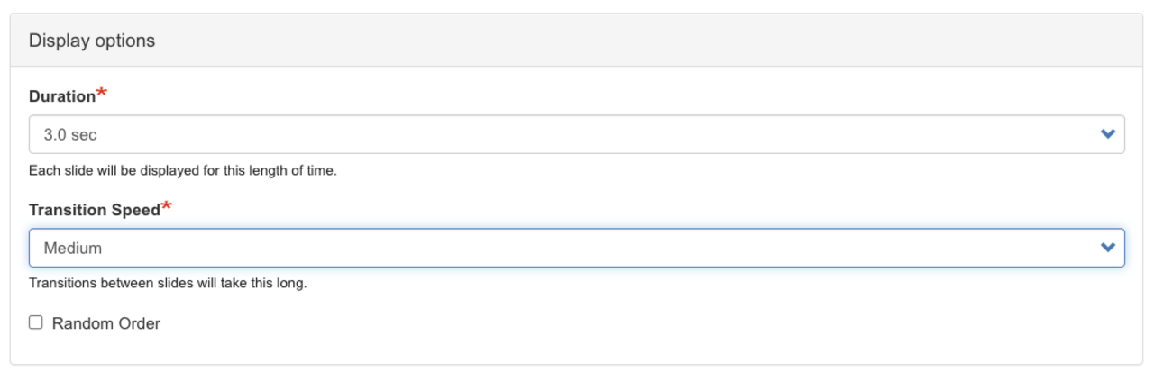 5. Set the slide duration and transition speed time. If you don't want the slides to appear in the same order each time, choose Random Order.