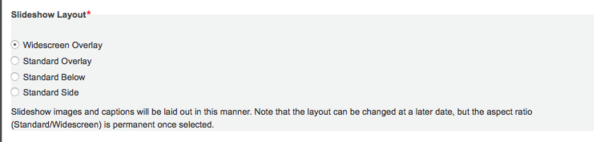 4. Choose a Slideshow Layout. If you choose Widescreen, it cannot be changed. If you choose one of the Standard layouts, you can change the layout to another standard layout but Widescreen will not be an option. You must enter a Headline for an image to see the overlay.