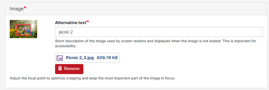 6. To upload an image, click Add Slide and then Choose File. You'll be prompted to add Alt Text. You can edit the focal point. When you move the cross, it changes how the image is centered in the slide space. Once you've added all your images, click Save.