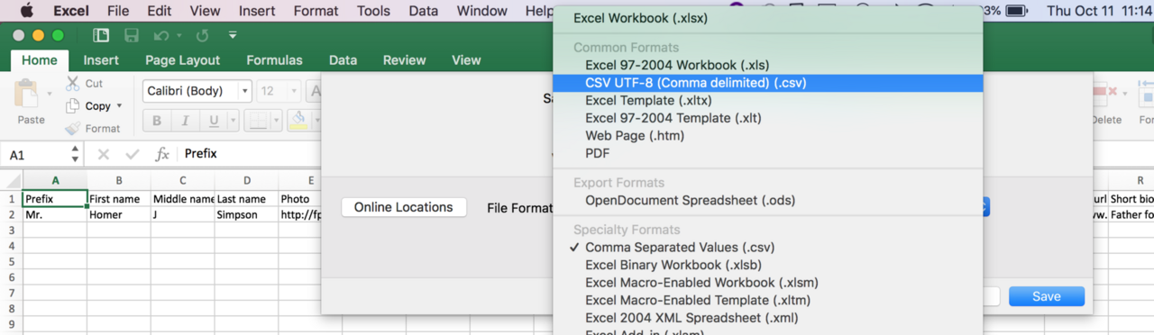 - In the file type drop-down menu, select CSV UTF-8 (Comma Deliminated) (*.CSV)
